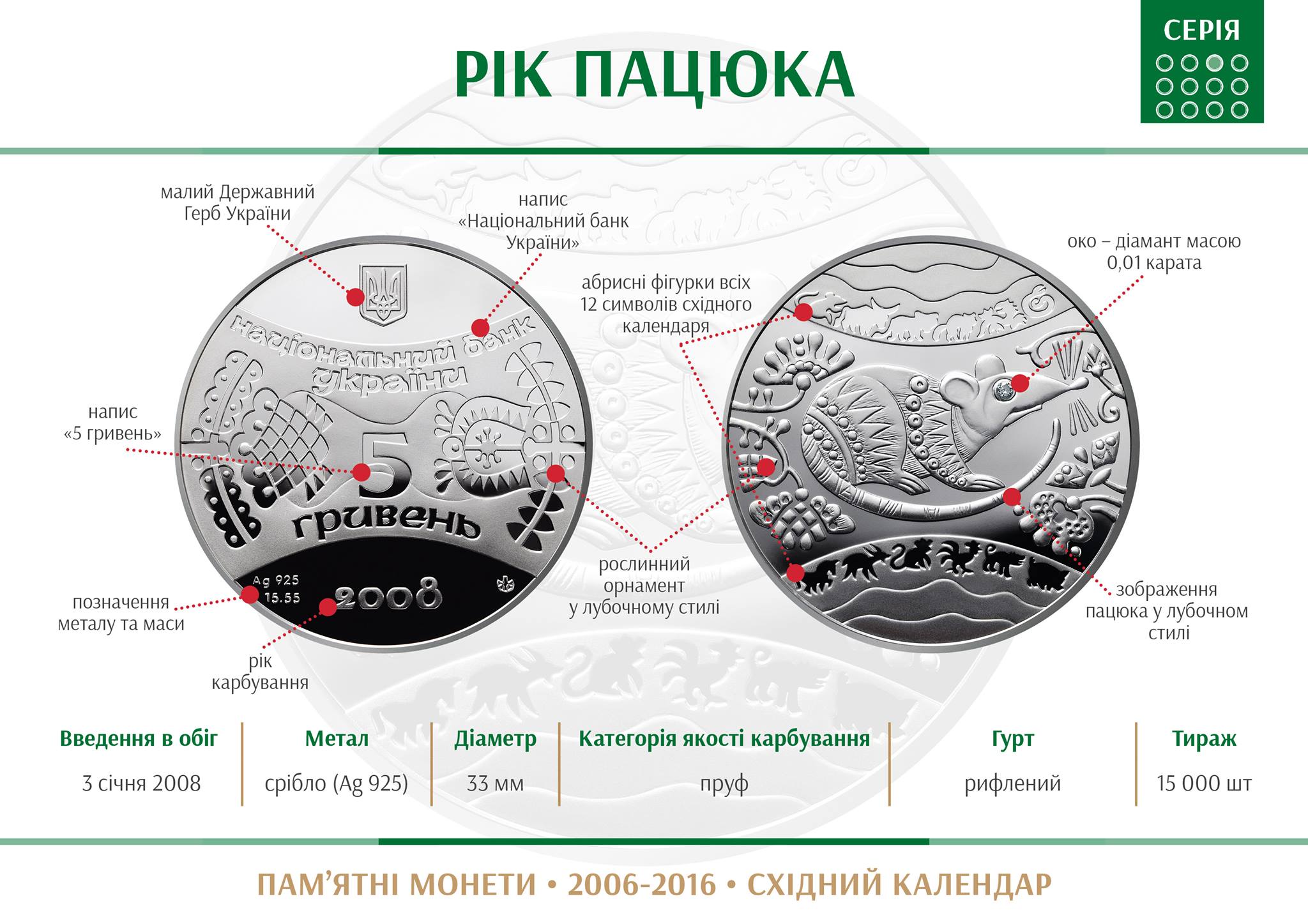 279. | 03.01.08 | 5 грн. | Рік Пацюка Оздоблення - діамант 0,01 карата | 15 | 925 | 15,55 | 33,0 | рифлена | пруф | Серія В |