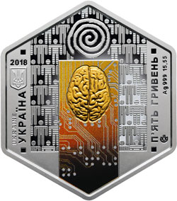 На аверсі монети розміщено: ліворуч: рік карбування монети 2018, малий Державний Герб України та написи UKRAINE/УКРАЇНА (вертикально); праворуч - номінал монети П`ЯТЬ ГРИВЕНЬ, позначення металу та маси монети в чистоті - Ag 999 15,55 (вертикально); угорі на тлі стилізованих людських силуетів графічно зображено спіраль часу - символ еволюції, розвитку, безперервності руху, життєвої сили, який зустрічається ще з часів трипільської культури, під якою стилізовану композицію - на коричневому тлі (використано тамподрук), заповненому мікросхемами, зображення людського мозку (локальна позолота). Унизу праворуч розміщено логотип Банкнотно-монетного двору Національного банку України.