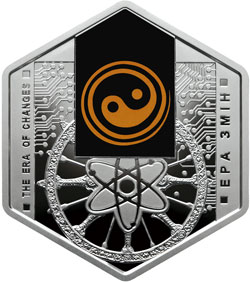 На реверсі монети розміщено: на тлі мікросхем композицію: на чорному тлі зображено кольоровий давній символ `Інь-Янь` (використано тамподрук), під яким архаїчне колесо - символ сонця, життєвого циклу, оновлення, мінливості, у центрі якого - атом, що символізує досягнення науки і техніки; вертикальні написи: THE ERA OF CHANGES (ліворуч) та ЕРА ЗМІН (праворуч).