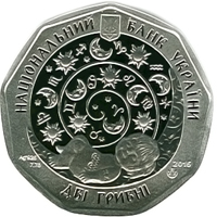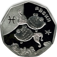 На реверсі монети зображено стилізовану композицію - ліворуч на матовому тлі символ знака зодіаку Риб, у центрі - рибки, угорі напис - РИБКИ.