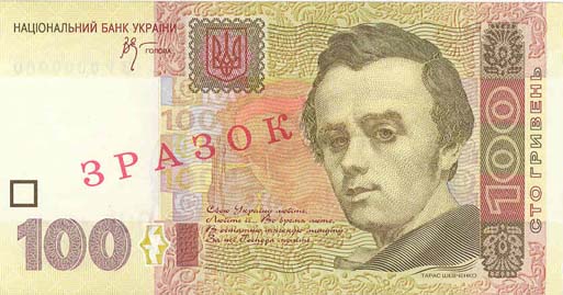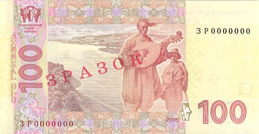 Банкнота номіналом 100 гривень 2005 року виготовлення.